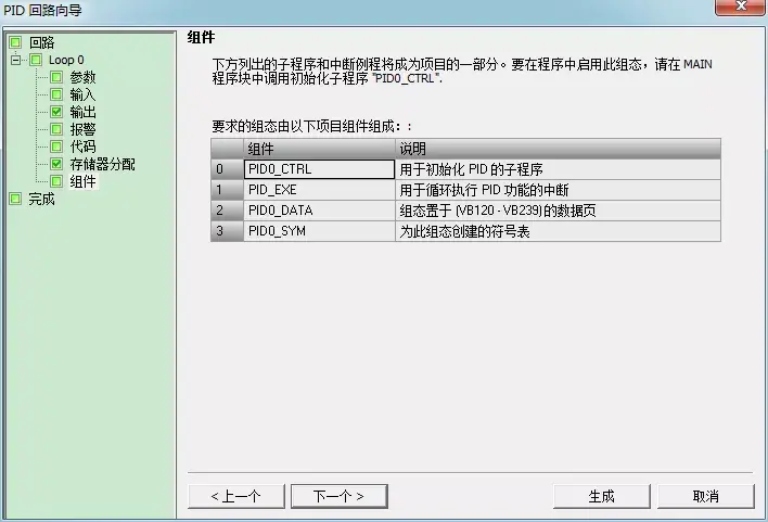 PID指令(功能块)使用了一个120个字节的V区参数表来进行控制回路的运算工作;除此之外,PID向导生成的输入/输出量的标准化程序也需要运算数据存储区。需要为它们定义一个起始地址,要保证该地址起始的若干字节在程序的其它地方没有被重复使用。如果点击'建议',则向导将自动为你设定当前程序中没有用过的V区地址。