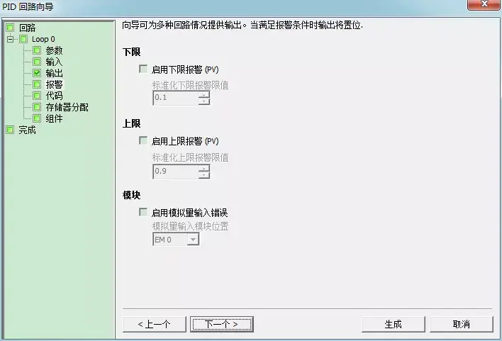 向导提供了三个输出来反映过程值(PV)的低值报警、高值报警及过程值模拟量模块错误状态。当报警条件满足时,输出置位为1。这些功能在选中了相应的选择框之后起作用。