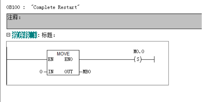 还是上面的滑台的例子。顺序功能图我们已经画出来了,需要用到初始化组织块OB100,在PLC上电或由STOP切换到RUN模式时,CPU调用OB100,在OB100中将M0.0~M0.7复位,然后用置位S指令将M0.0置位。如下图所示