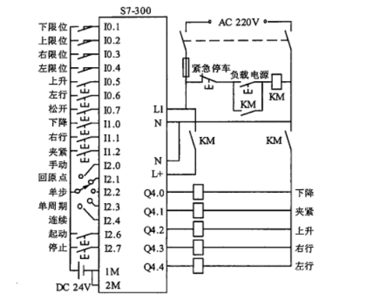 如上图,机械手用来将工件从A运到B,操作面板如右图所示,Q4.1控制加紧电磁阀,为1时加紧工件,工作方式选择开关有5个位置,操作面板的6按钮是手动按钮,为保证在紧急情况下能可靠的切断PLC的负载电源,设置了交流接触器KM(如下图所示),运行时按下负载电源按钮,使KM线圈得电并自锁,KM的主触点接通,给外部负载提供电源,当紧急情况时,按下紧急停车按钮来断开电源。
