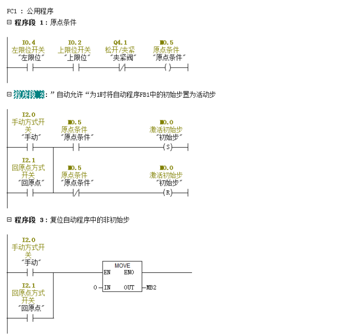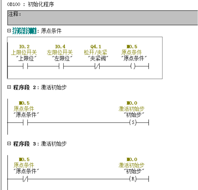 首先在OB100编写初始化程序,根据功能说明的初始条件编写,如下图所示: