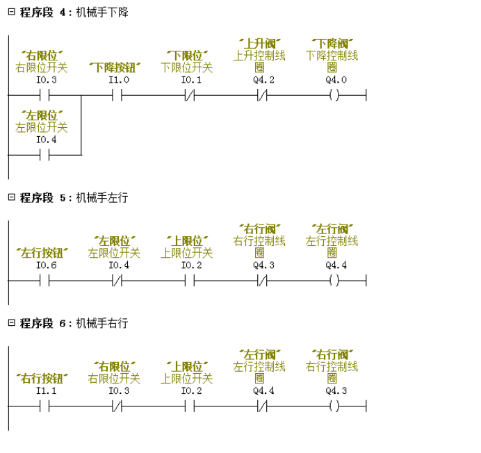3)在连续工作方式下,按下启动按钮,机械手从初始步开始工作一个周期后,反复连续的动作。