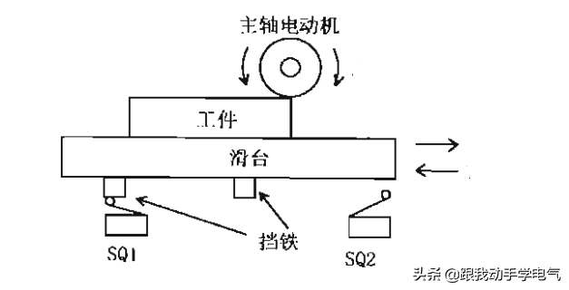 当按下启动按钮,滑台前进,同时主轴正转,滑台前进到前极限SQ1,自动反转,如此反复,要求滑台每反复运动一个循环,主轴方向改变一次。当按下停止按钮,滑台和主轴都停止。