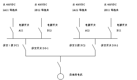 图1是珠海发电厂一台机组保安系统的系统图。一台机组设有两段保安PC及一台柴油发电机,每段保安PC设有三路电源,以保安Ⅰ段PC1为例,电源开关A11和B12各来自400VPC,它们互为备用,来自柴油发电机的保安电源开关DG-1为以上两组开关的备用,同理,保安Ⅱ段PC2电源开关A12和B11互为备用, 来自柴油发电机的保安电源开关DG-2为以上两组开关的备用。