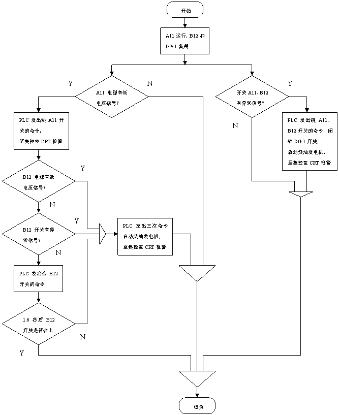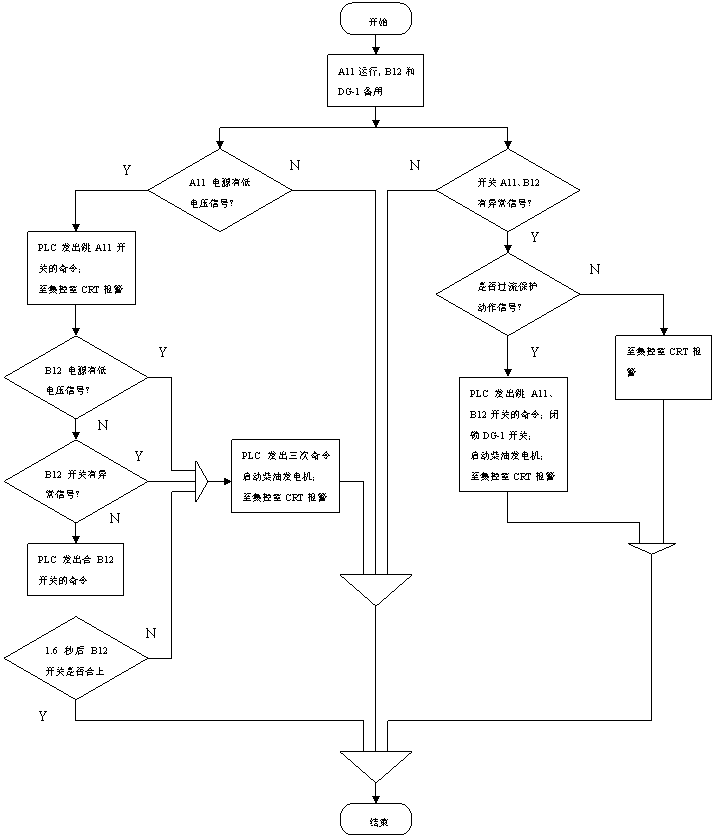另一路启动逻辑为开关异常启动。开关异常信号有三种:有过流保护跳闸信号、开关失去操作电源、开关控制方式把手打到"LOCAL"。系统正常运行时,例如电源开关A11运行,B12备用,此时如两电源开关A11和B12任一开关有异常信号,则PLC马上发出跳A11和B12开关的命令,并闭锁保安开关DG-1,同时发出报警,柴油发电机启动空转。