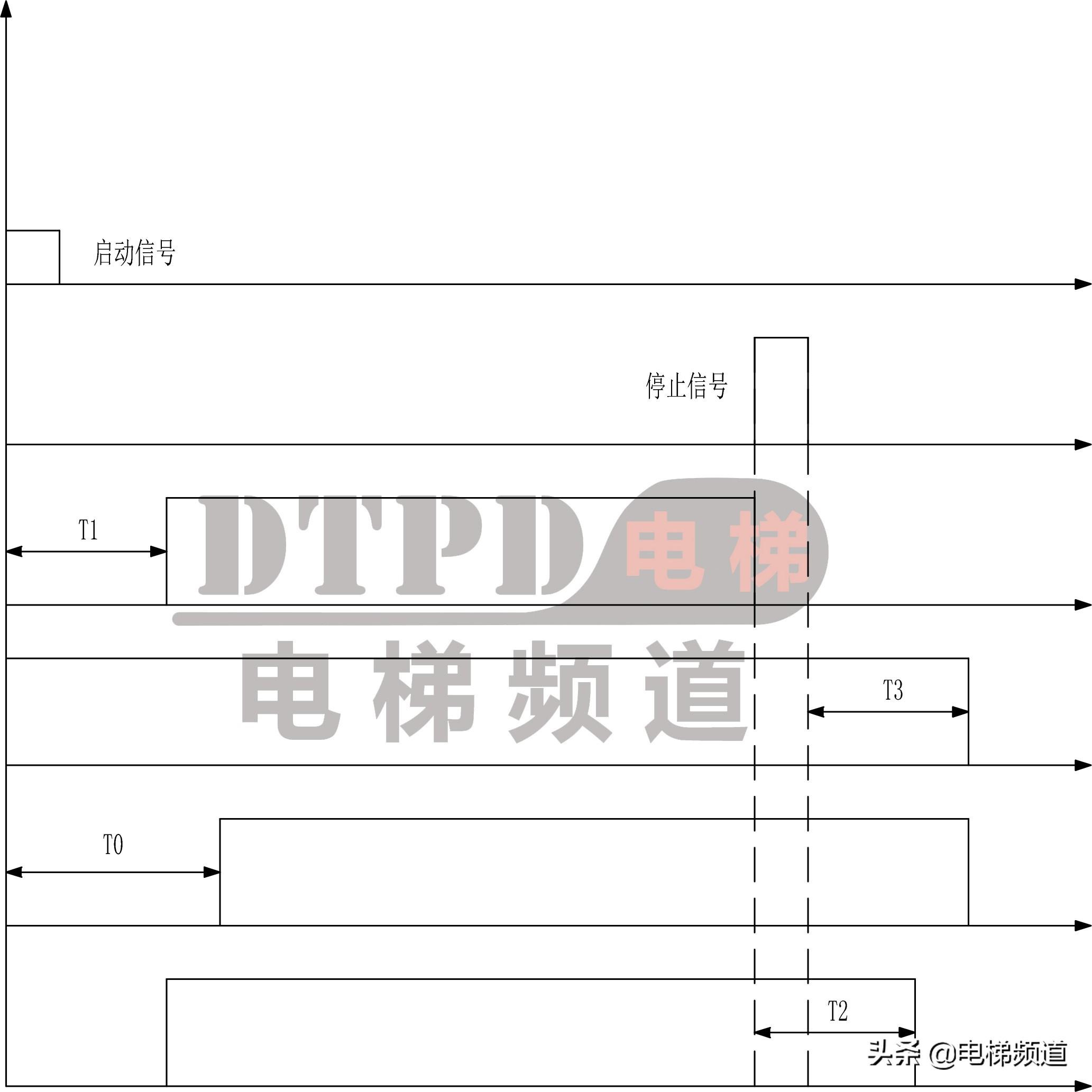 当电梯确定好运行方向(向下运行)后,运行接触器Y12吸合,给轿厢提供一个预转矩防止电梯因重力作用倒溜。经过时间继电器T0设定时间后,Y13输出(抱闸接触器吸合)打开抱闸,经过时间继电器T1设定的时间后,Y1输出(给变频器下行使能信号),Y2、Y4输出(给变频器频率信号),电梯启动运行。