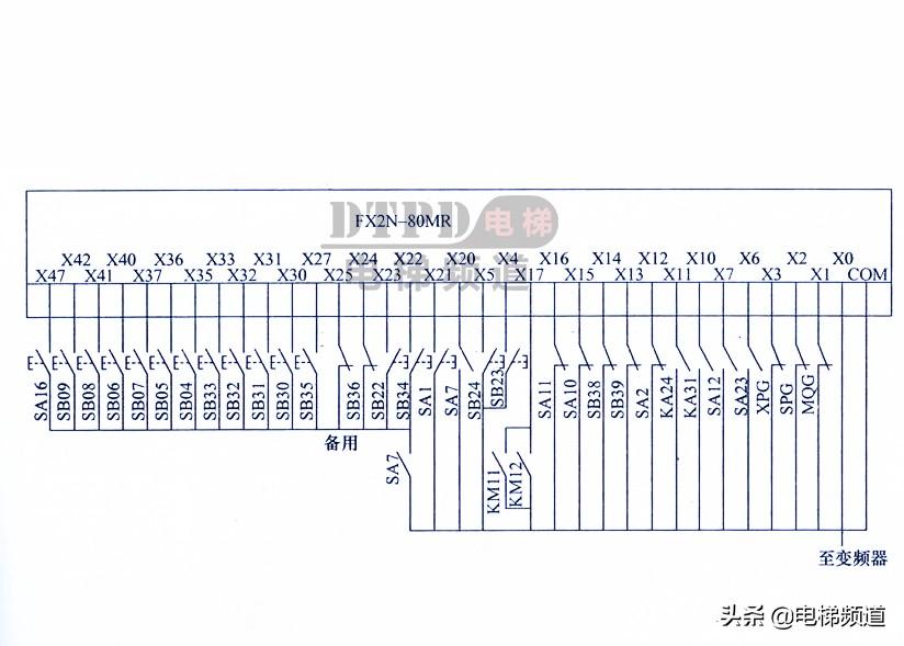 安全保护信号安全继电器2个点;门锁继电器2个点、上换速开关+下换速开关2个点;上限位开关+下限位开关2个点;抱闸接触器1个点;主电路运行接触器1个点;超载信号1个点;满载信号1个点,共12个点。