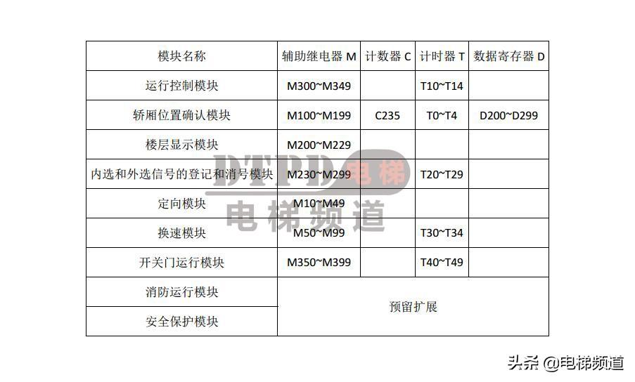在进行软件设计的过程中,尽量采用模块化设计的方法,这样可以提高程序的可读性和方便多人进行编写。通常将程序分为以下几个模块,运行控制模块、轿厢位置确认模块(楼层位置的确定、换速位置信号的获取)、楼层显示模块、内选和外选信号的登记和消号模块、定向模块、换速模块、开关门运行模块、消防运行模块、安全保护模块等,并对PLC的资源(M、C、T、D)进行分配。