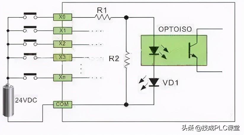 直流电可以由PLC内部提供也可以外接直流电源提供给外部输入信号的元件。R2在电路中的作用是旁路光电耦合器内部LED的电流,保证光电耦合器LED不被两线制接近开关的静态泄漏电流导通。