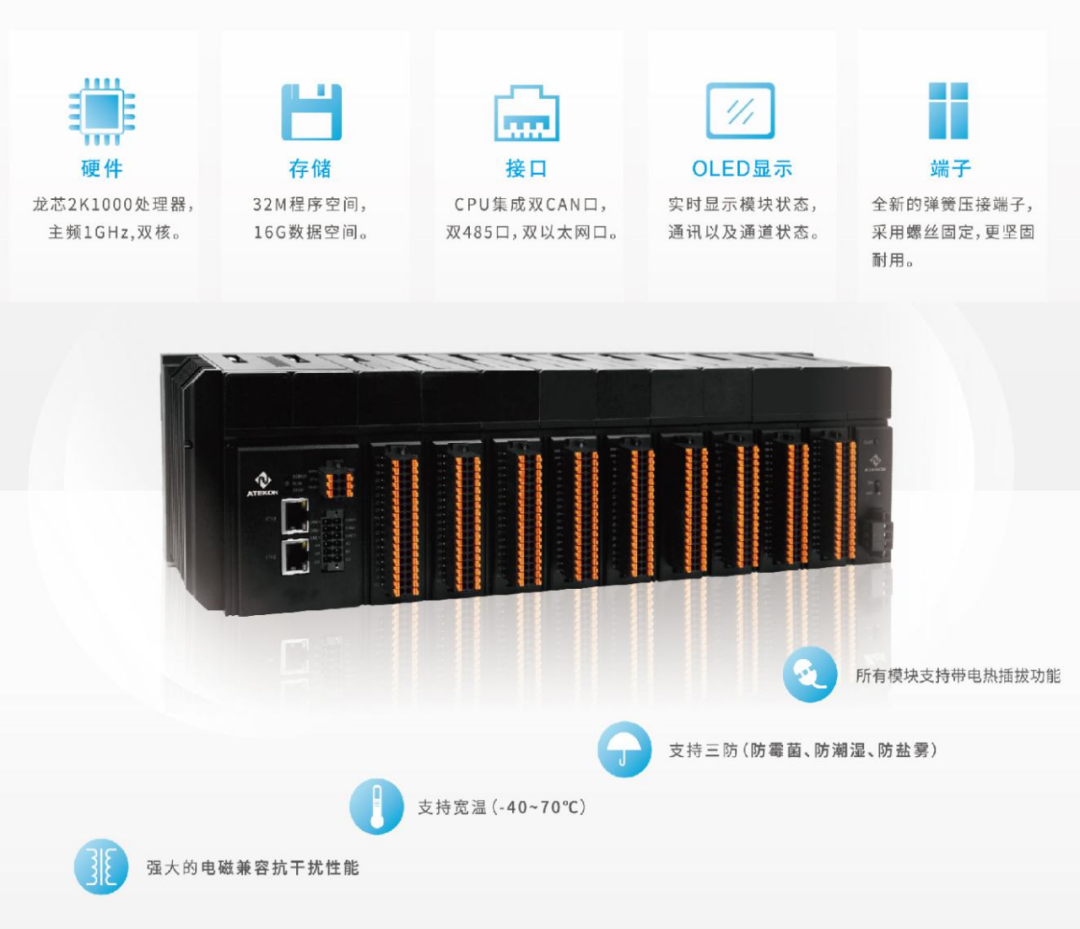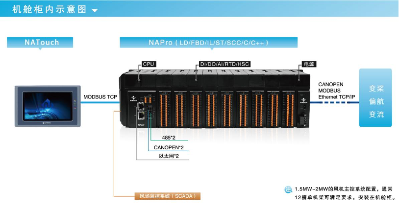 机架可带DI/DO/AI/RTD/HSC模块,可用于风机控制状态采集和处理,风机转速采集,并可在CPU本体通讯接口不足前提下带载485或者CANOPEN等通讯模块,作为和变桨、偏航、变流、变频器、风速仪等设备通讯用。