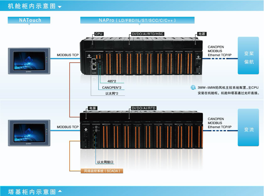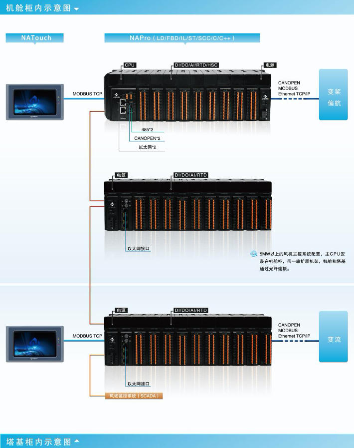 对于3MW~5MW的风机主控系统,通常分为机舱控制部分和塔基控制部分,主CPU放在机舱柜内,两者之间通过光纤连接。变桨、偏航等设备通讯主要在机舱柜内,变流器通讯在塔基柜内,风机转速采集高速计数模块通常安装在主机架。