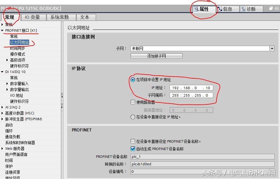 3 在常规栏,选择PROFINET 接口[X1]/以太网地址属性,设置CPU的IP地址,本例设置为 192.168.0.10,如下图所示: