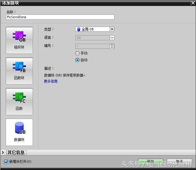1 添加发送数据块。该数据块用于存储PLC向LabVIEW发送的数据。点击程序块/添加新块,在打开的对话框中选择数据块,输入名称,如 PlcSendData ,类型可选择全局DB。注意如果不一次性传输大量数据,可以直接使用PLC变量,单次发送一个数据,不需要创建数据块。