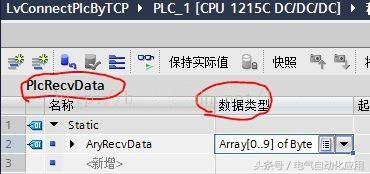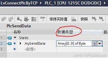 2 打开该数据块PlcSendData ,添加数据,名称如 ArySendData,选择数据类型Array of Byte,即字节数组,数组长度设置为10。