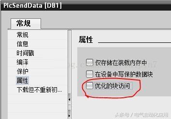 3 修改数据块属性。选中数据块PlcSendData ,右键属性,在属性栏去掉优化的块访问,以支持绝对寻址模式。