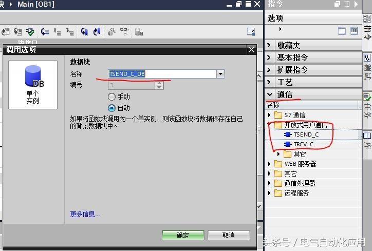 2 添加指令通信/开放式用户通信/TSEND_C到程序段1,调用选项的数据块名称采用默认。