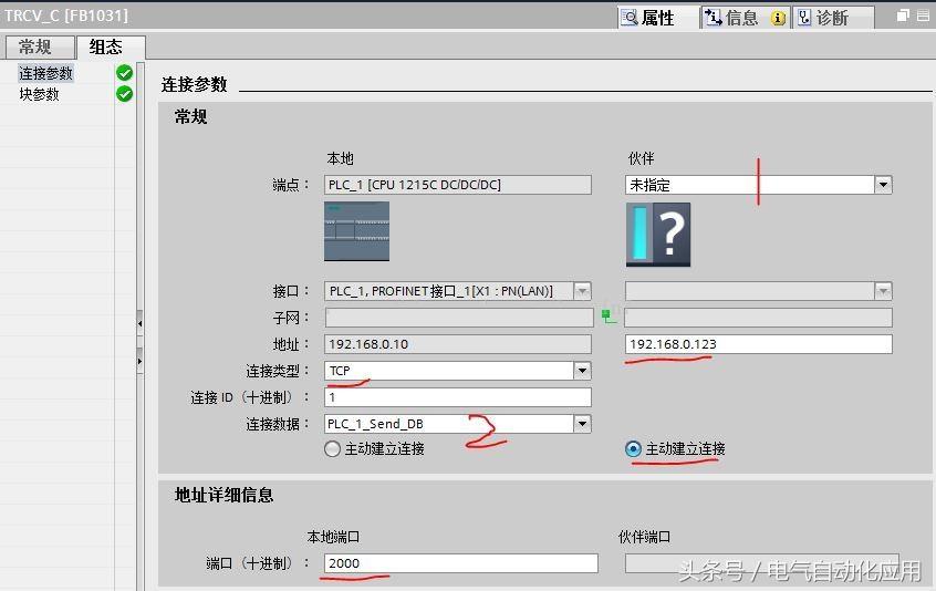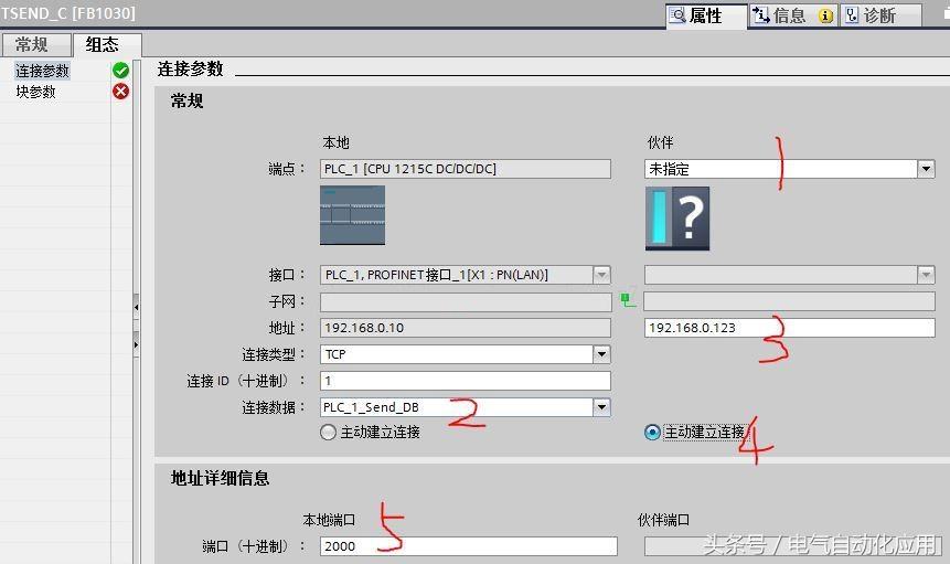 3 配置 TSEND_C 的通讯参数。选中 TSEND_C,右键属性,切换到组态页,选择连接参数属性。伙伴项选择未指定,连接数据选择新建,系统会自动创建一个连接数据 ,如PLC_1_Send_DB。输入伙伴的IP地址,如192.168.0.12。由伙伴主动建立连接 ,PLC的端口可保留默认的2000。连接类型为TCP,连接ID采用默认值。(注:所谓伙伴即与PLC通信的另一方,可以为上位机PC、HMI等)