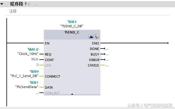 4 配置 TSEND_C 的输入输出。TSEND_C在检测到参数 REQ 上升沿时执行发送作业,因此每次发送数据时,都应在REQ上产生一个脉冲,此处为了简便,调用系统时钟 Clock_10Hz(每秒10次),周期性的发送数据。参数DATA为待发送的数据,此处调用数据块 PlcSendData。注意 DATA采用纯符号寻址时,发送 LEN 应设置为0,而采用绝对寻址时,应设置为实际发送数据的长度。通讯状态参数 DONE\BUSY等按需要连接。
