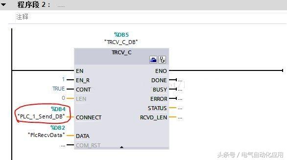 3 配置 TRCV_C 的输入输出。TRCV_C在检测到参数 EN_R 为1时启动接收。参数DATA为数据接收区,此处调用3.2步骤所创建的数据块PlcRecvData。注意DATA采用纯符号寻址时,接收 LEN 应设置为0,而采用绝对寻址时,应设置为实际发送数据的长度。通讯状态参数 DONE\BUSY等按需要连接。具体参数信息请查看帮助文档。