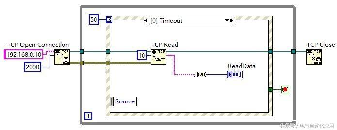 2) 读取数据TCP Read。输入读取长度10(PLC程序的发送数据块长度为10个字节)。