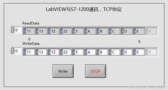 5) 前面板如下。点击 Write,把数据WriteData写入PLC,同时PLC把该数据发回LabVIEW,通过 ReadData显示。如果ReadData数据与WriteData一致,即通信正常。