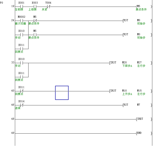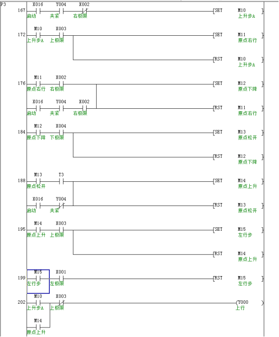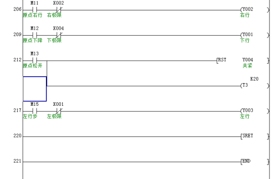 左限位X1、上限位X3、夹紧阀打开Y4的常闭点构成原点条件M5。
