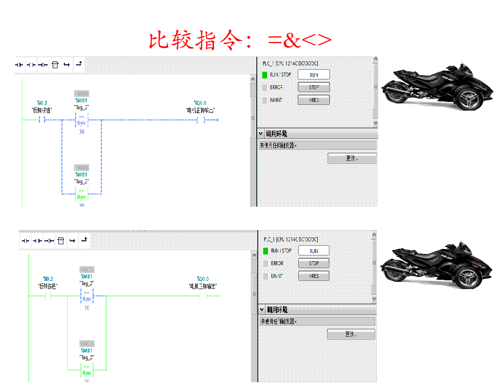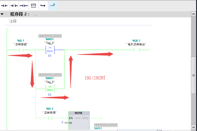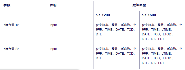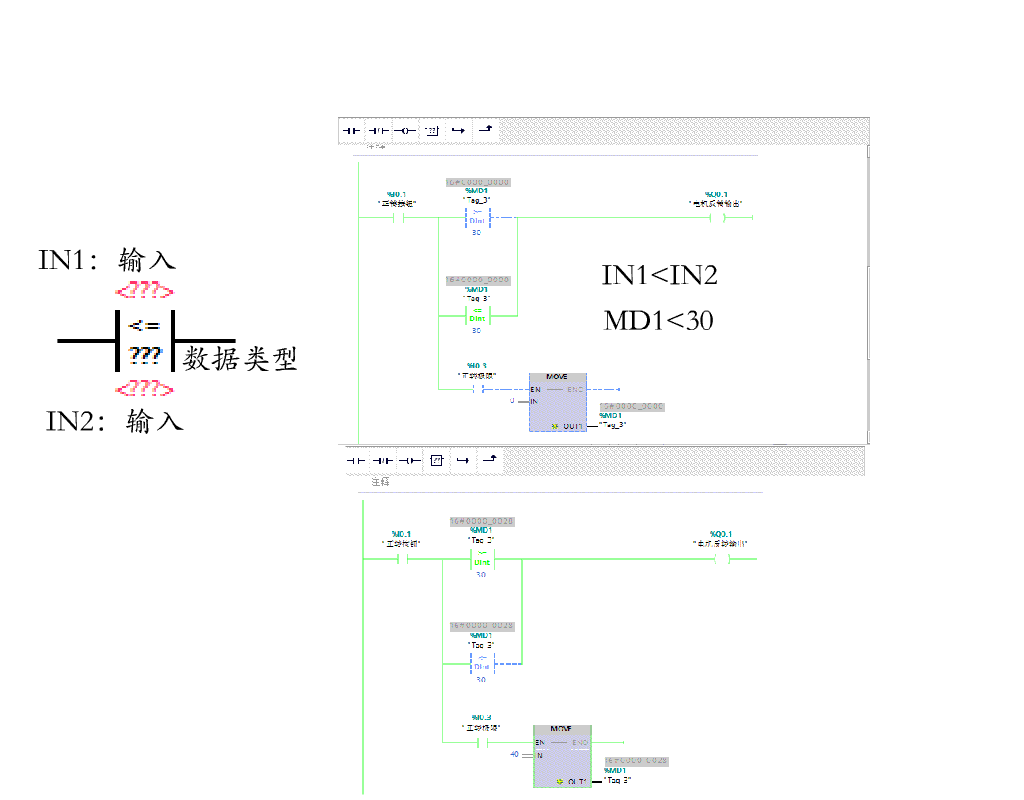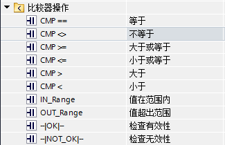 比较指令: 用于比较数据的大小,按照所比较的数据类型不同可分为整数比较、双精度整数比较、实数比较三种类型,将IN1和IN2的数据进行比较,比较时必须保证两个数的数据类型相同,数据类型可以是整数、长整数和实数。