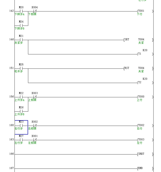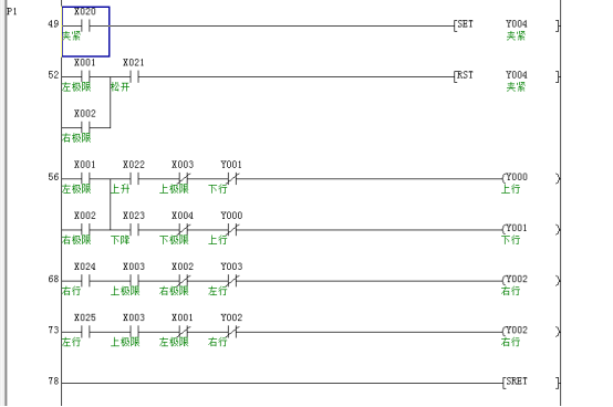 (3)夹紧装置夹紧状态,并且不在右极限:先执行上升-右行-下降-松开-上升-左行到左极限。