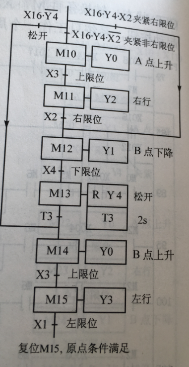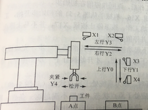 (2)夹紧装置夹紧状态,并且机械手在右极限:执行B点下降-松开-上升-左行到左极限