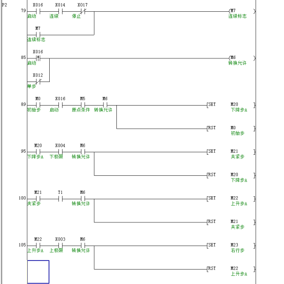 (2)单步工作方式:当单步选择X12为ON,在第86步电路,转换允许M6在一般情况下为OFF,只在按下启动的第一个扫描周期M6为ON,执行到第89步,M20被置位为活动步,使M20带的Y1得电。