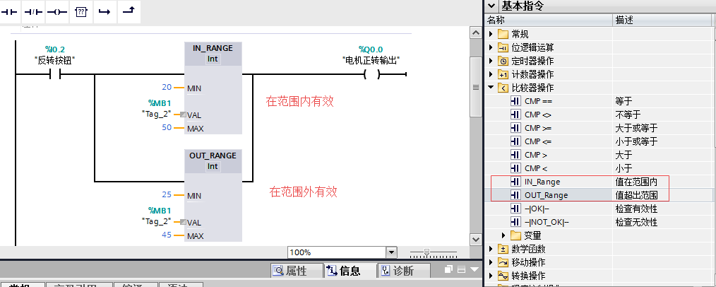 串联比较指令时,将进行“与”运算。并联比较指令时,将进行“或”运算。2.4 IN_RANGE: 值在范围内 & OUT_RANGE: 值超出范围