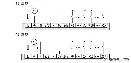 如果把S/S接入24V时,那么信号就需要从X输入点流出,然后再流入S/S,这种方式称为漏型,相反S/S接入0V,称为源型,确定了漏型和源型,才能够选择传感器类型。