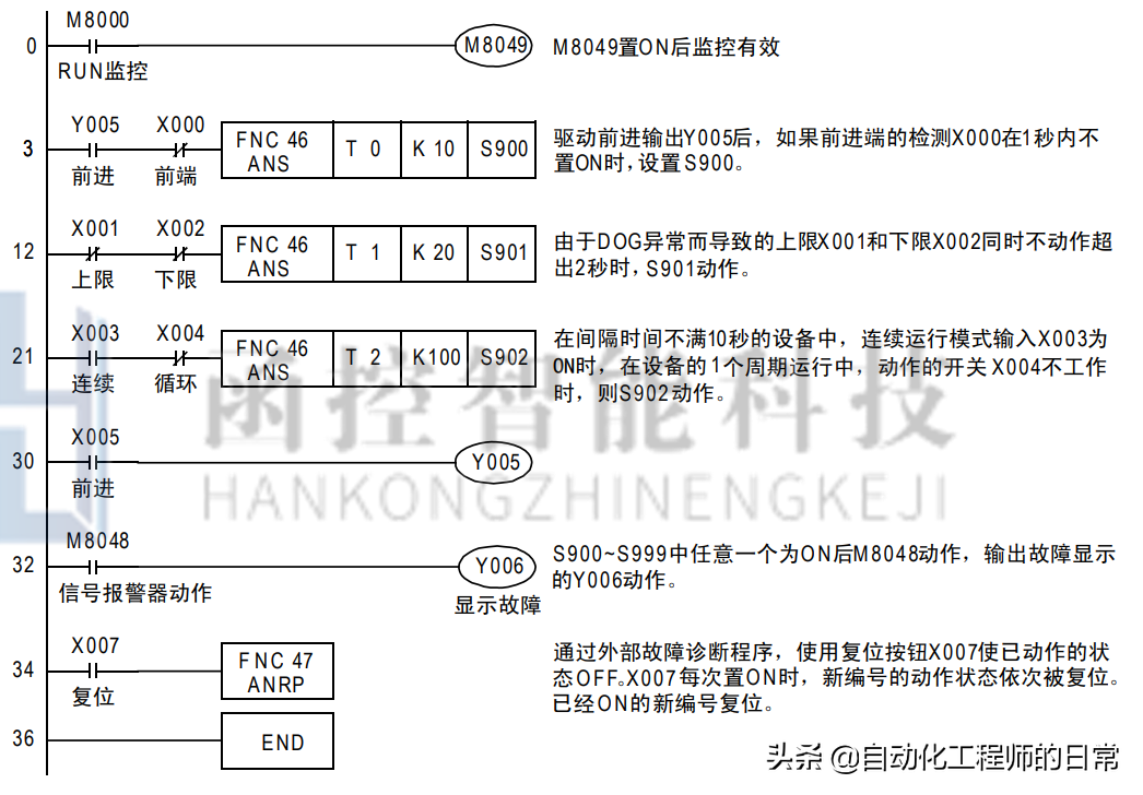 在进行报警处理时,可以通过M8048输出总的故障信号;通过D8049查询最小报警编号 。这个非常有用,使用亦非常方便。