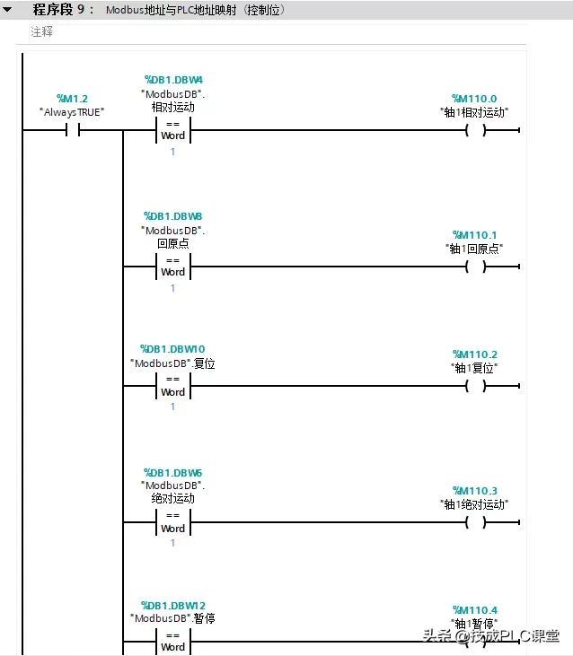 从公开免费和使用范围的角度来考虑,这里采用ModbusTCP通信协议,因为你学会了ModbusTCP,意味着市场上的大部分仪表、PLC通信你都可以搞得定,PLC程序编写如下所示: