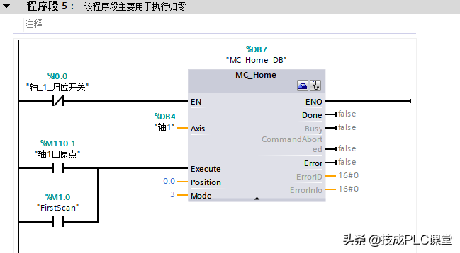 11.程序段5,调用MC_Home,各个引脚填写如图所示,该程序段主要用于执行归零