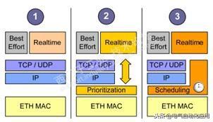 工业以太网一般使用IEEE 802.3中定义的以太网标准。针对自动化系统的网络节点辅助采用了服务质量( QOS)机制。PROFINET作为工业以太网之一,它采用了三种不同的方法来实现。这样既满足了普通以太网的需求,又满足了工业系统对不同应用的实时性的要求。如下图1所示。