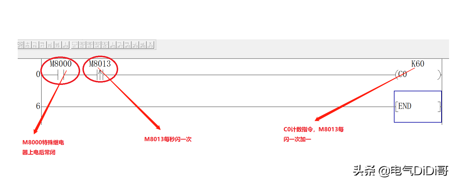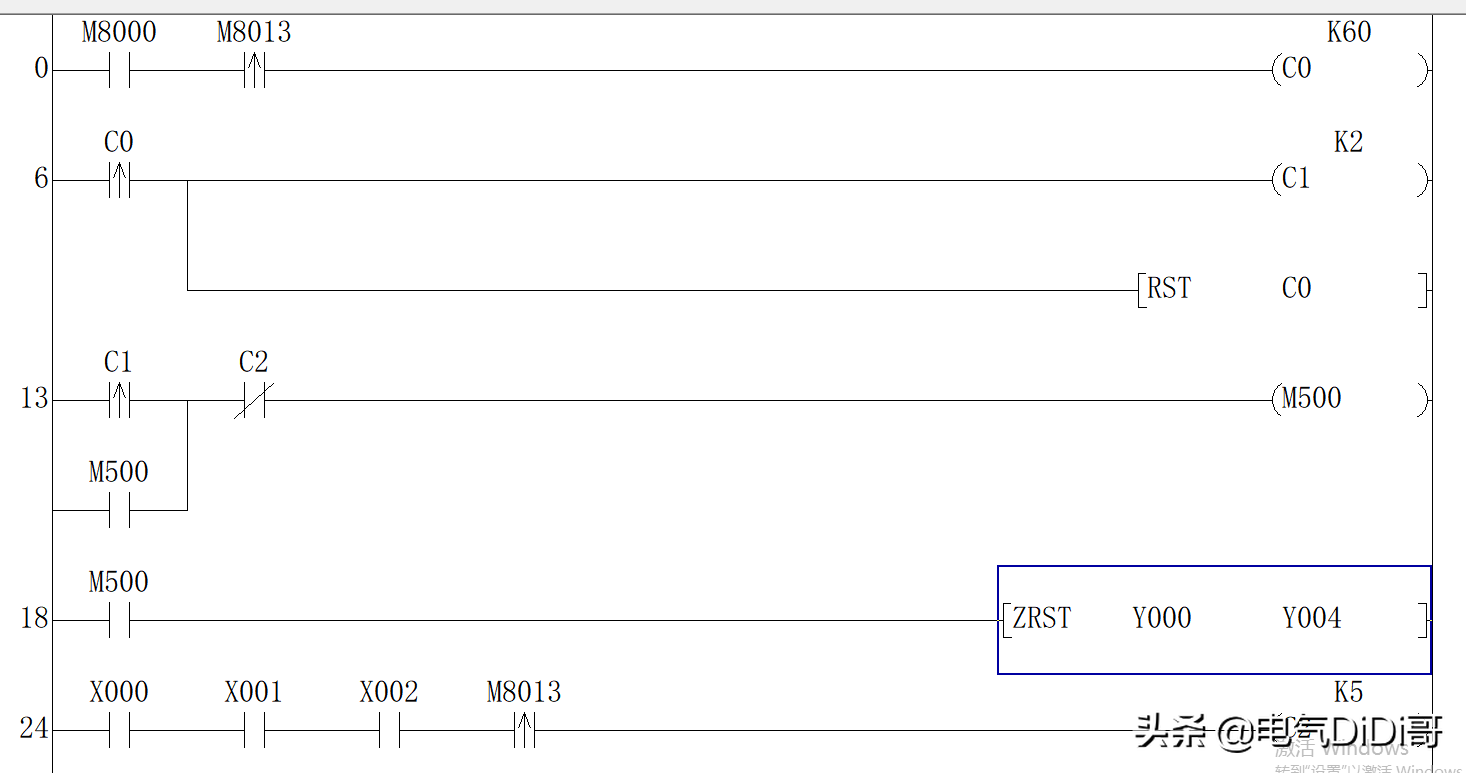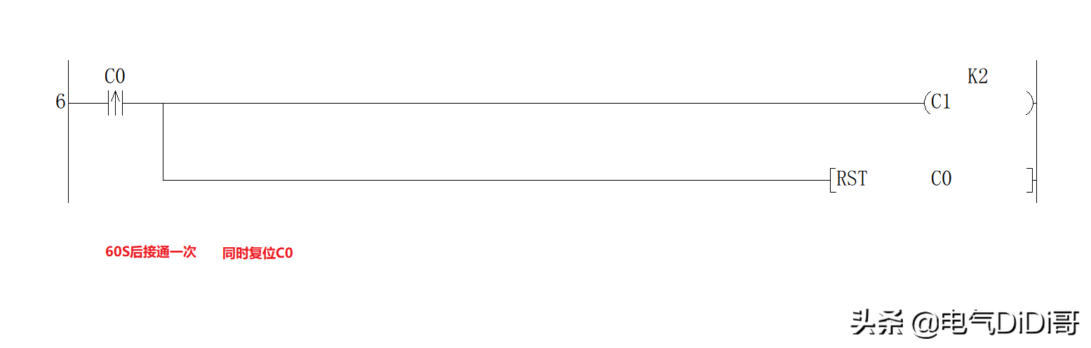 当到达60s后时,接通C0,此时C0接通一次C1加一,同时复位C0,当C1等于2时C1接通,常开变常闭