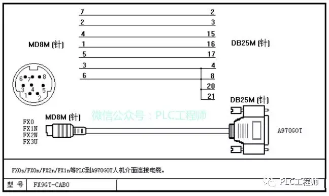 FX2、A系列PLC到A970G0T人机界面连接电缆