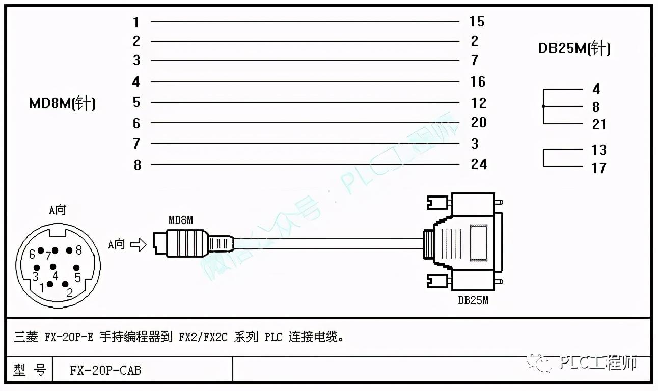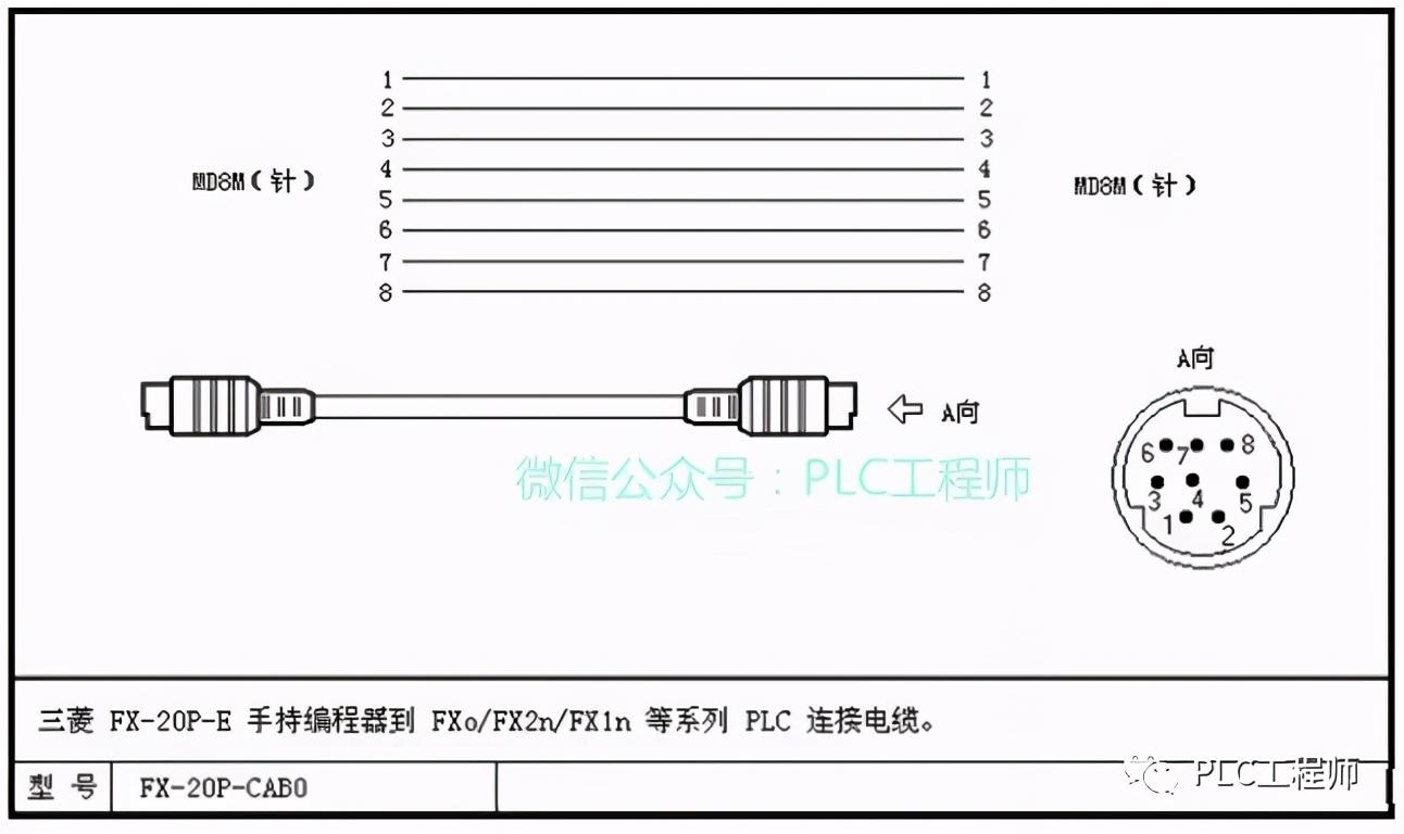 三菱FX-20P-E手持编程器到FX2/FX2C系列PLC连接电缆