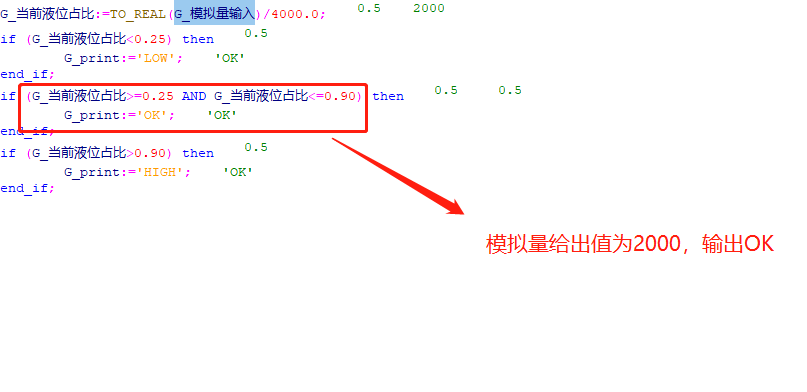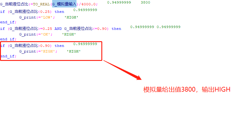 然后我们将模拟量的输入值模拟为2000和3800,那么这两个值在整个占比中分别为50%和95%。按照程序设定,我们分别会得到OK和HIGH的运行结果。