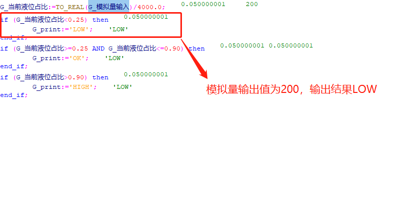 首先我们将模拟量的输入值模拟为200,那么这个值在整个占比中为5%。因为小于设置的25%,因此结果输出为LOW。