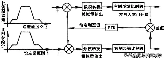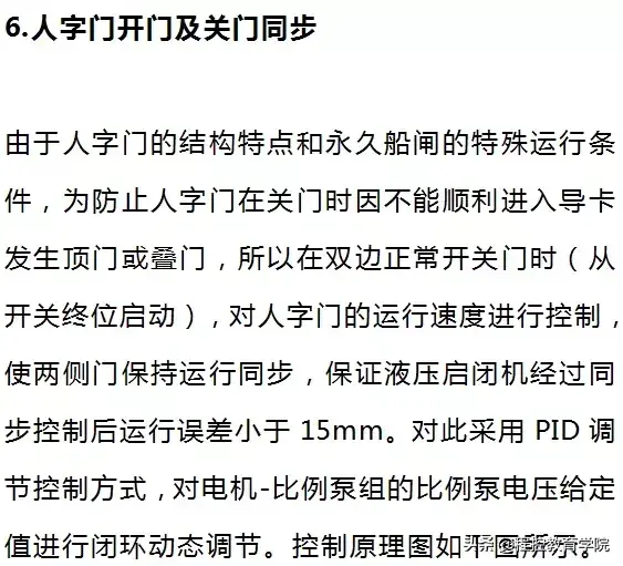 程序运行时,对两侧人字门开度差进行检测,根据开度差,经PID运算后给定比例泵电压调整值,改变人字门运行速度。同时限定调整值的变化范围和幅度,防止人字门运行过快和抖动。当人字门开度差超过设定范围20mm时A类报警。