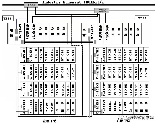 每个集控控制站由4个电源模块、2个中央处理器(CPU-417H)、4个通信模块(CP443-1)、2个ET200远程站、8个数字量输入模块(DI)、6个数字量输出模块(DO)、2个操作员面板PC670等组成。每个现地控制子站由1个电源模块、1个中央处理器(CPU-417H)、2个通信模块(CP443-1)、4个ET200远程站、2个模拟量输入模块(AI)、2个模拟量输出模块(AO)、15个数字量输入模块(DI)、8个数字量输出模块(DO)、2个SM338模块、操作员面板TP37等组成。