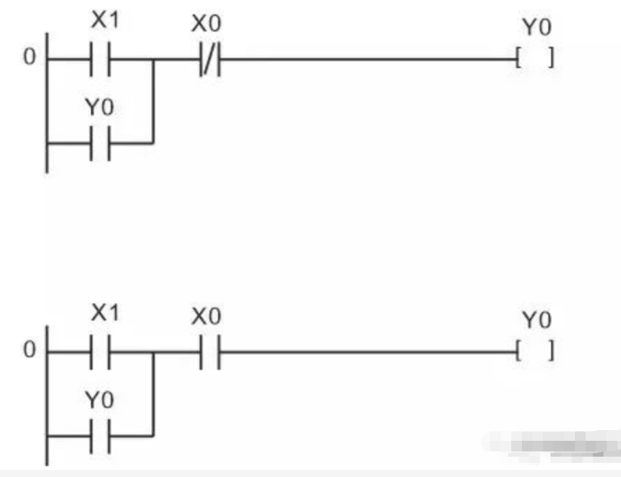 输入端的电气原理图中停止按钮SB0用常闭触点,串在控制线中,用于停机控制。启动按钮SB1用常开触点。在设计的两个梯形图完成的控制功能相同,但停机信号X0使用的触点类型不同,那么连接在端点的外部停机按钮触点类型也就不同。