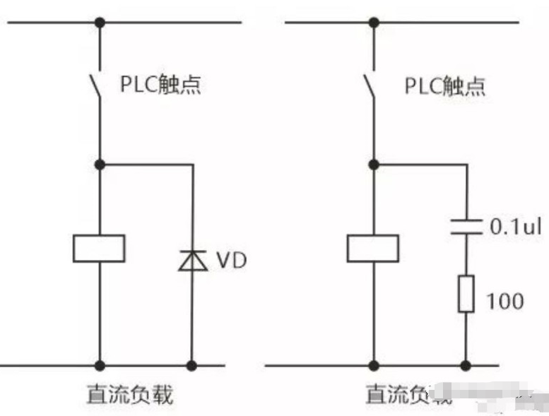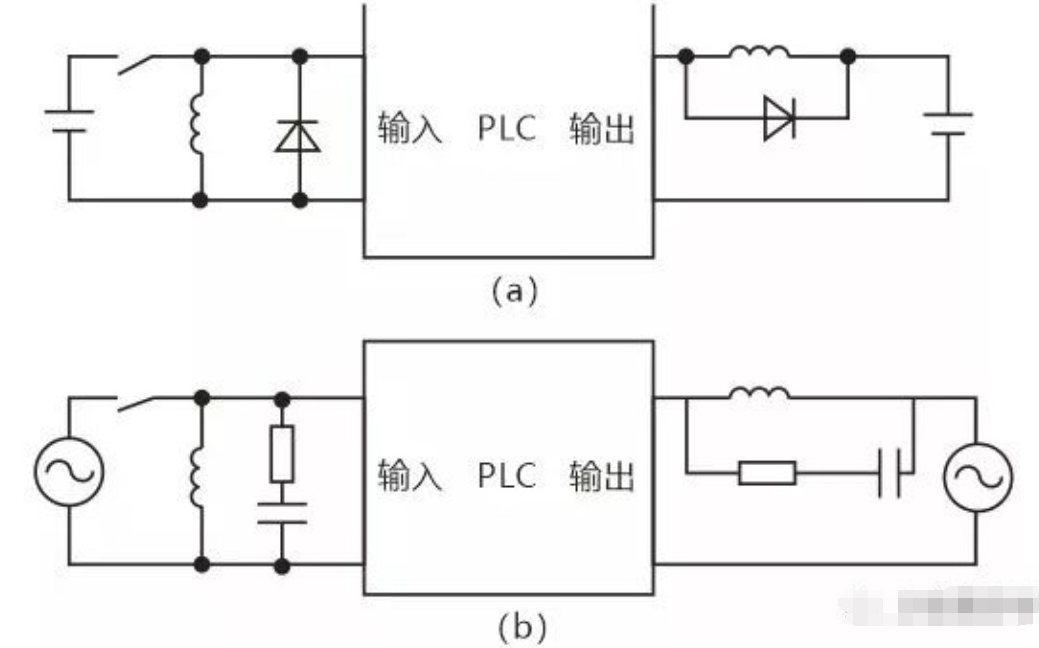 当PLC输入输出端接有感性负载元件时,直流输出的续流管保护(直流电路两端并联续流二极管),交流输出阻容吸收电路。