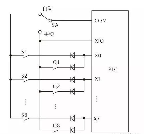 如图上系统分自动和手动两种工作方式,Q1-Q8为手动方式用到的 输入信号,S1-S8为自动方式用到的输入信号。S1和Q1共用输入点X0,PLC运行时只会用到其中一组信号,所以可以共用PLC的输入点。(图中二极管是用来防止寄生回路,避免错误输入信号的产生。