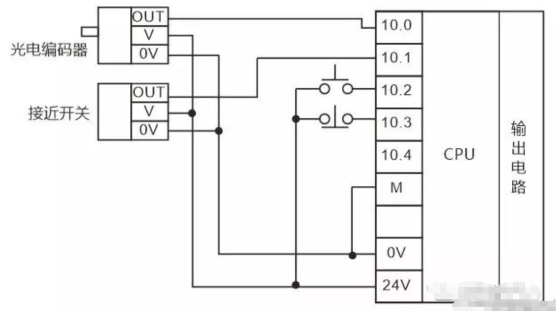 直流有源输入输入信号一般都是24V,这类信号与其他无源开关量信号混合接入PLC输入点时电压的0V点一定要接。上图输入点I0.0,I0.1连接光电编码器,接近开关的输出OUT信号,它们的驱动电源由PLC自身的24V电压提供