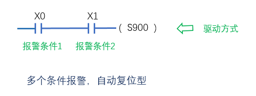多个条件报警,自动复位型。如果有多个条件满足,就产生一个报警,当然其中一个报警条件断开,自动复位报警