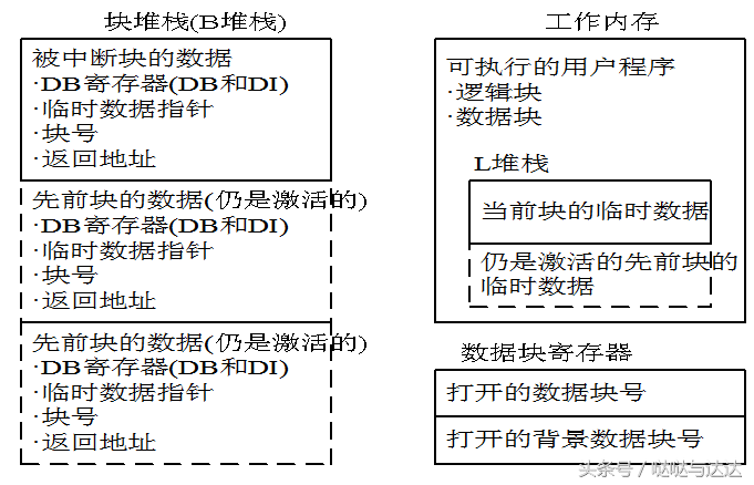块堆栈简称B堆栈,是CPU系统内存中的一部分,用来存储被中断的块的类型、编号、优先级和返回地址;中断时打开的共享数据块和背景数据块的编号;临时变量的指针(被中断块的L堆栈地址)。
