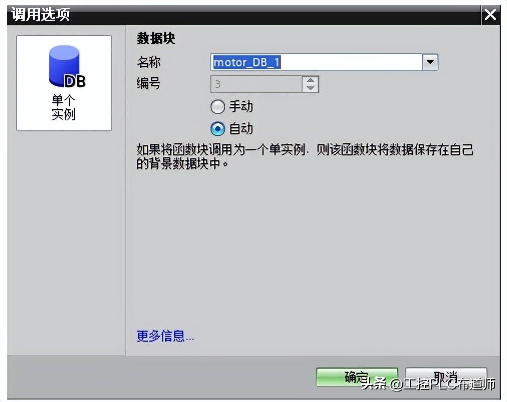 添加新块,选择 DB 块,类型选择 motor(FB2 的背景数据块),如图 13 所示。
